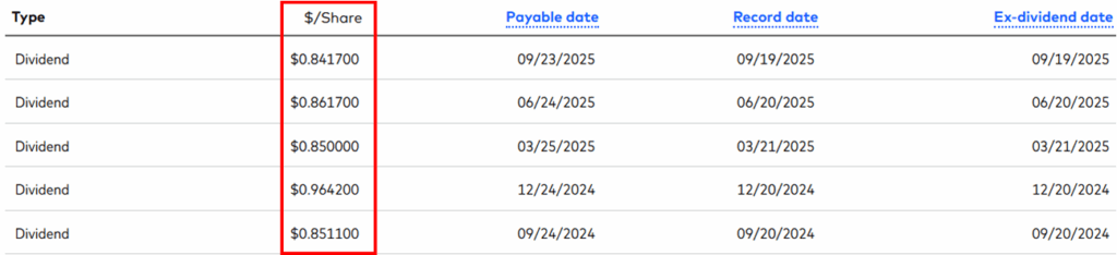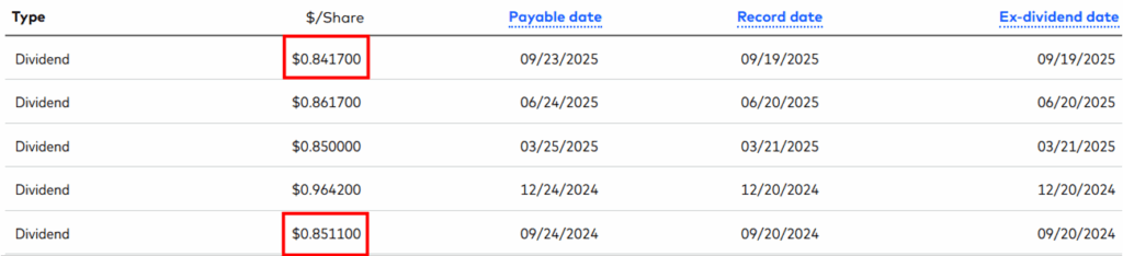 直近の分配金は$0.85前後ですが、今回は少し下回る$0.84となりました。
