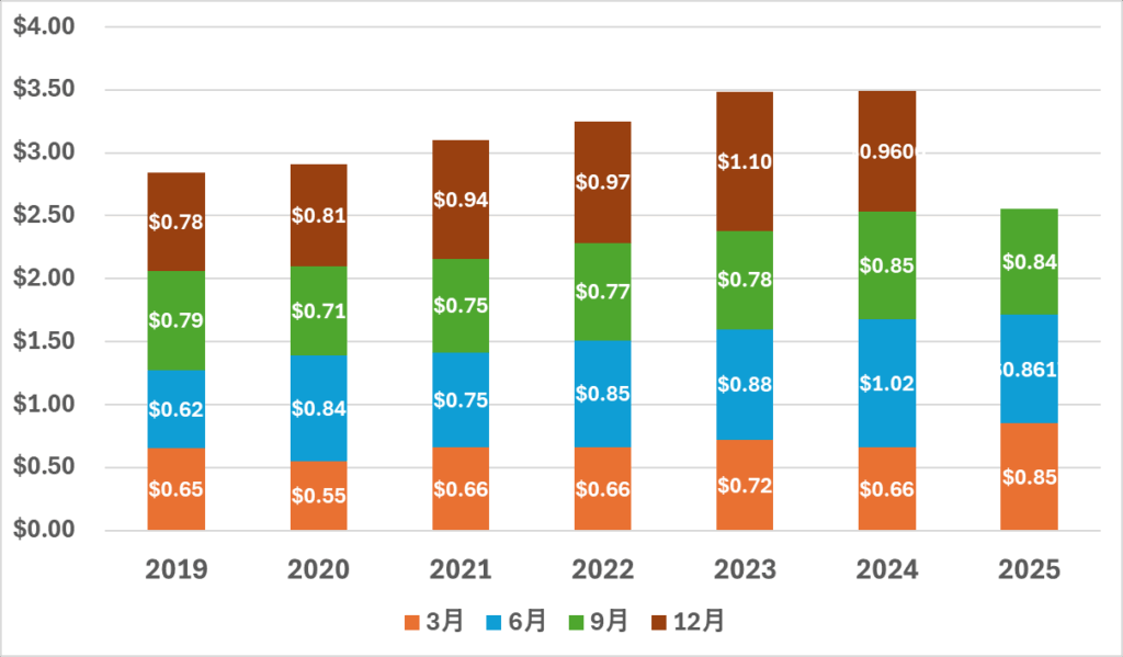 24年合計が$3.49だったので、25年12月が$0.9366以上であれば15年連続増配となります。